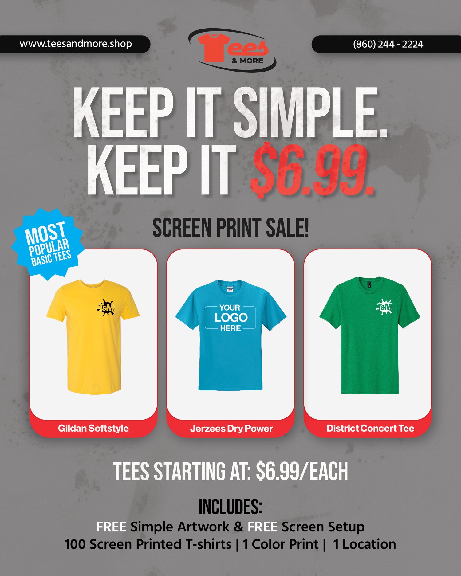 We're keeping it simple and super affordable. For a limited time, get your custom screen printed t-shirts starting at only $6.99 each. Choose from our most popular basic tees and more!